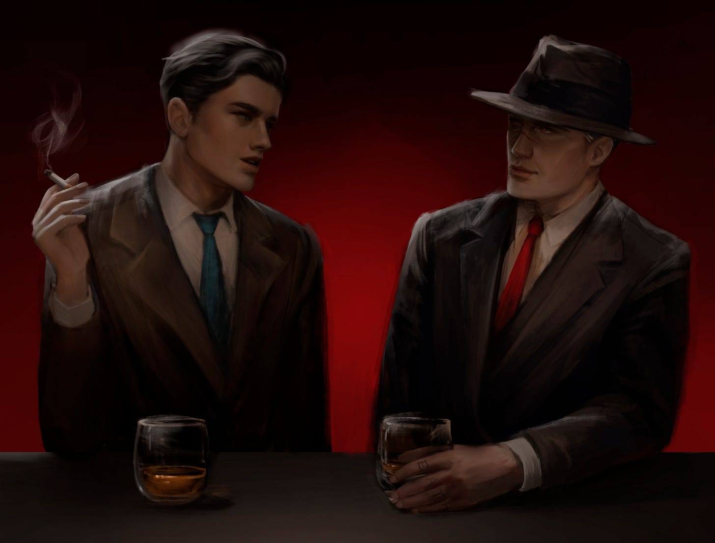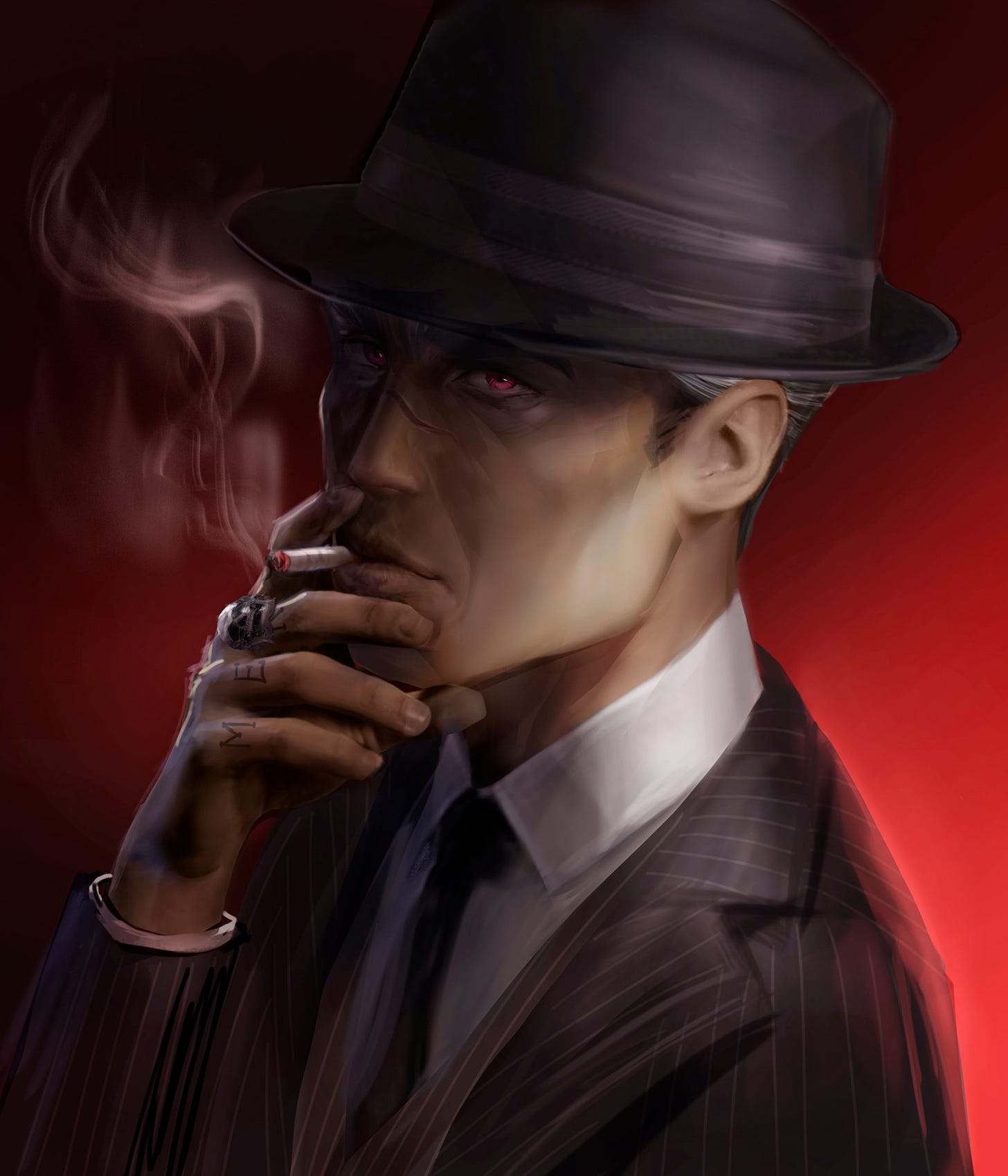“A broad, tall man melted from the black. his appearance was like the slow drawing of a knife: glittering and lethal. A snap-brim fedora obscured his features. A cigarette slid to the corner of his mouth.”