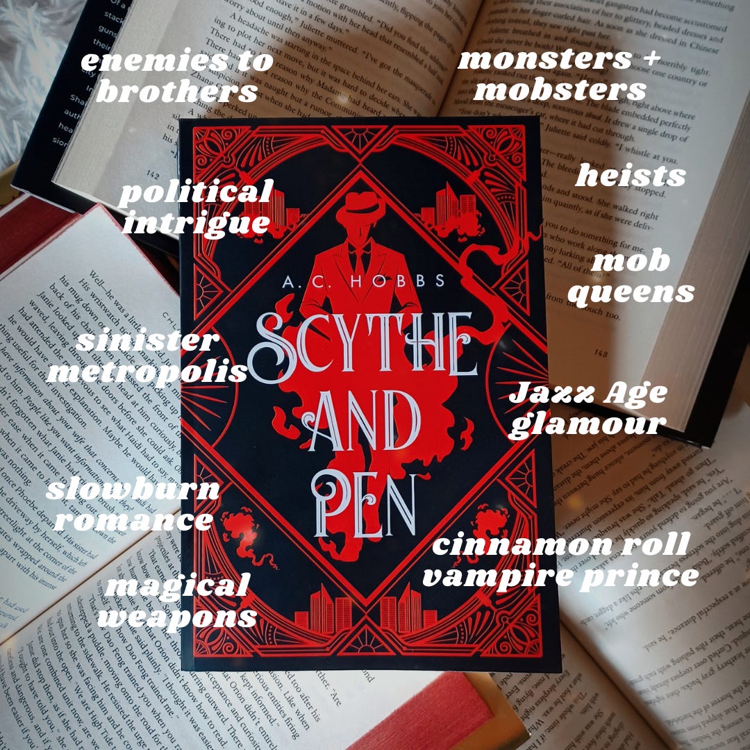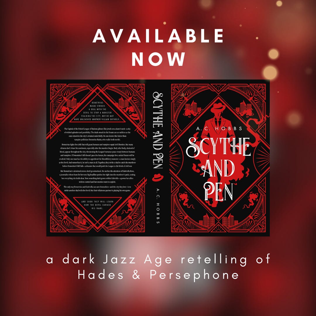 Scythe and Pen is a dark fantasy thriller set in a magical Jazz Age. A vampire prince strikes a deal with a cursed gangster to catch a murderer stalking their city. But the gangster is running his own vengeful con. Innocent lives get caught between them, including a beautiful and ambitious journalist who threatens to expose their partnership.